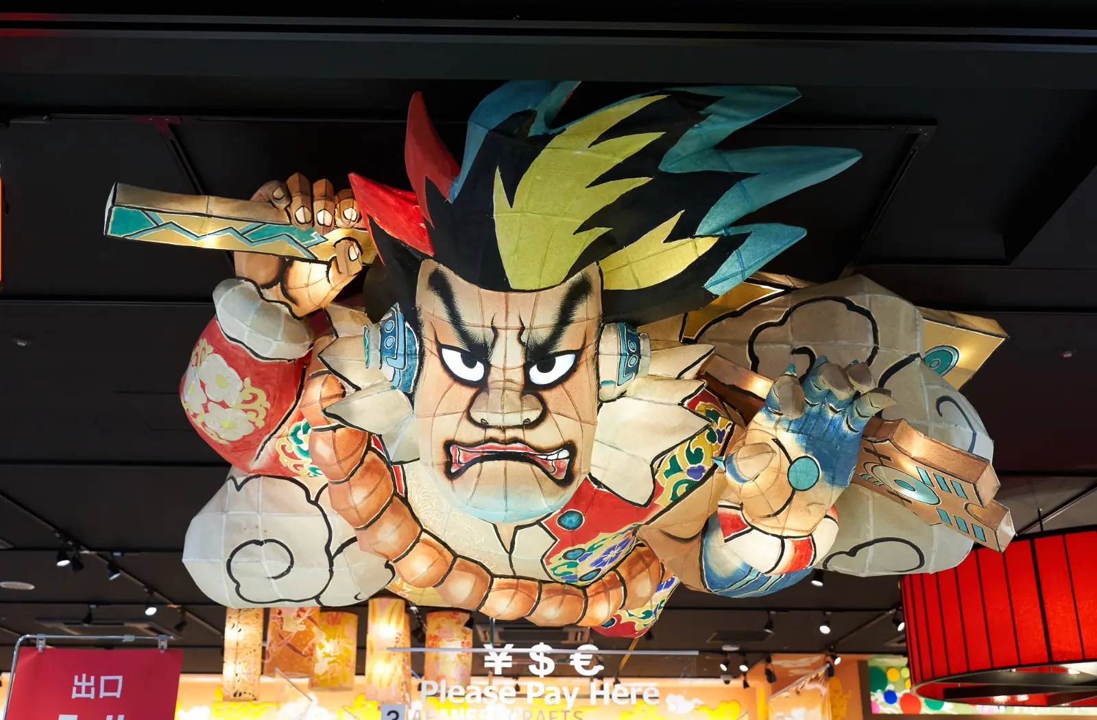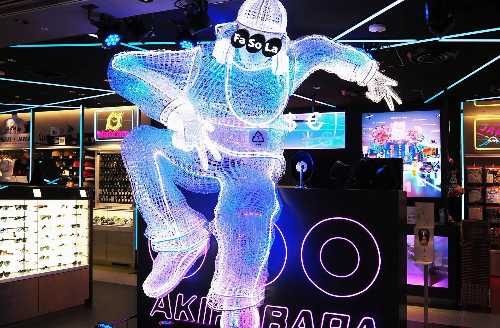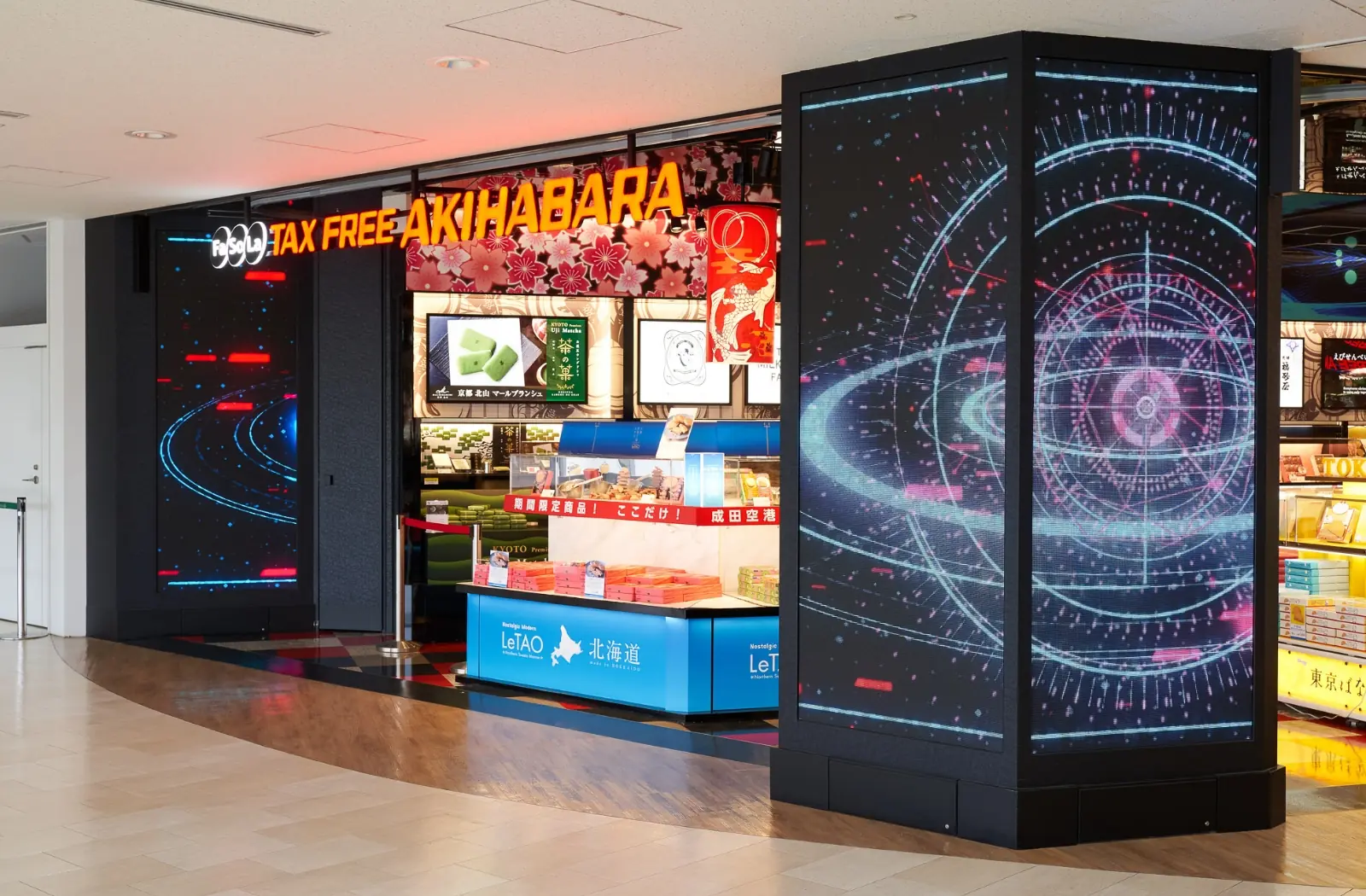 The store features "Nebuta made by famous artist", "Fa-So-La original animated characters", "Neon lights and digital effects" and other elements to entertain visitors as they depart from Narita Airport.