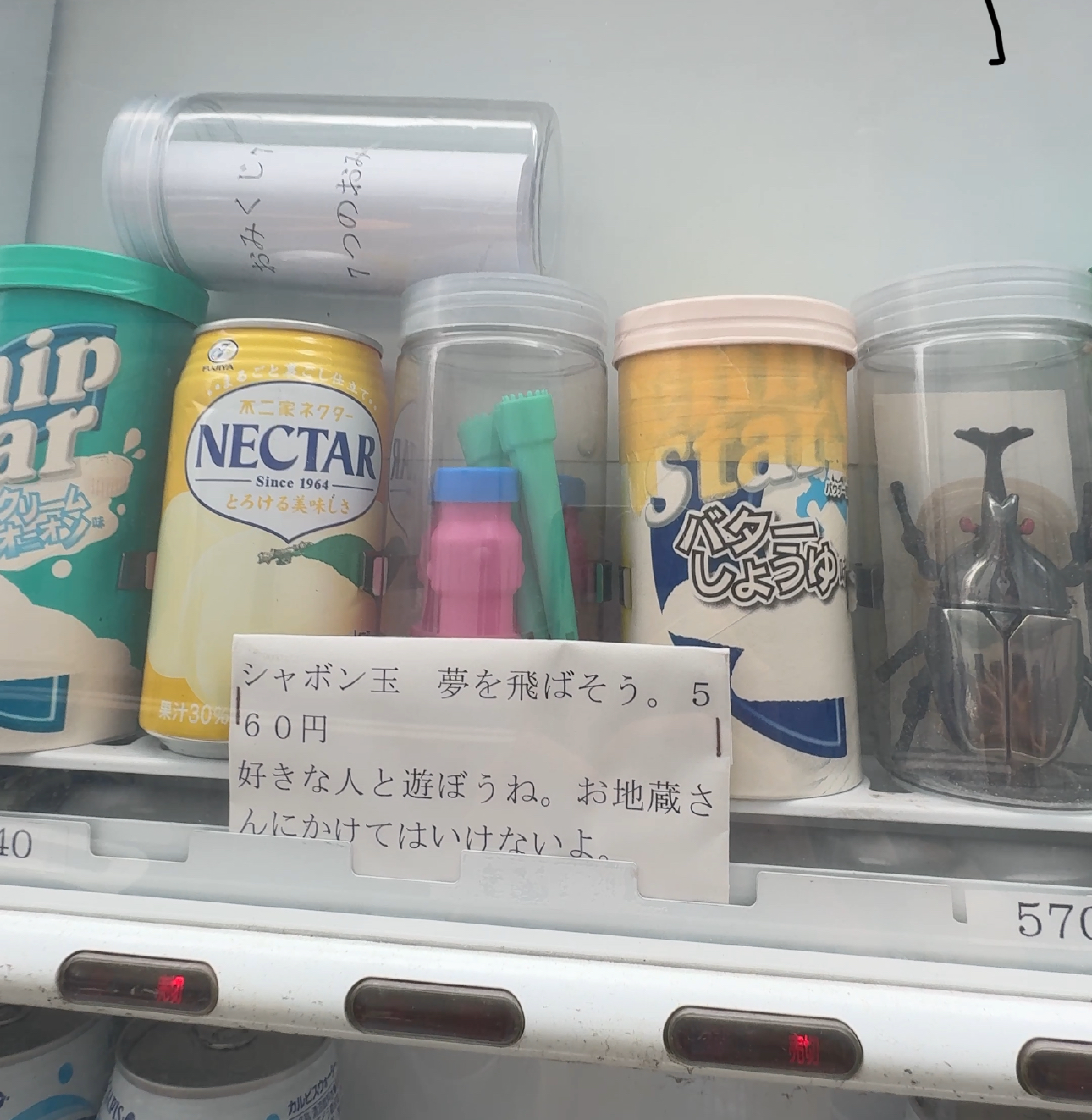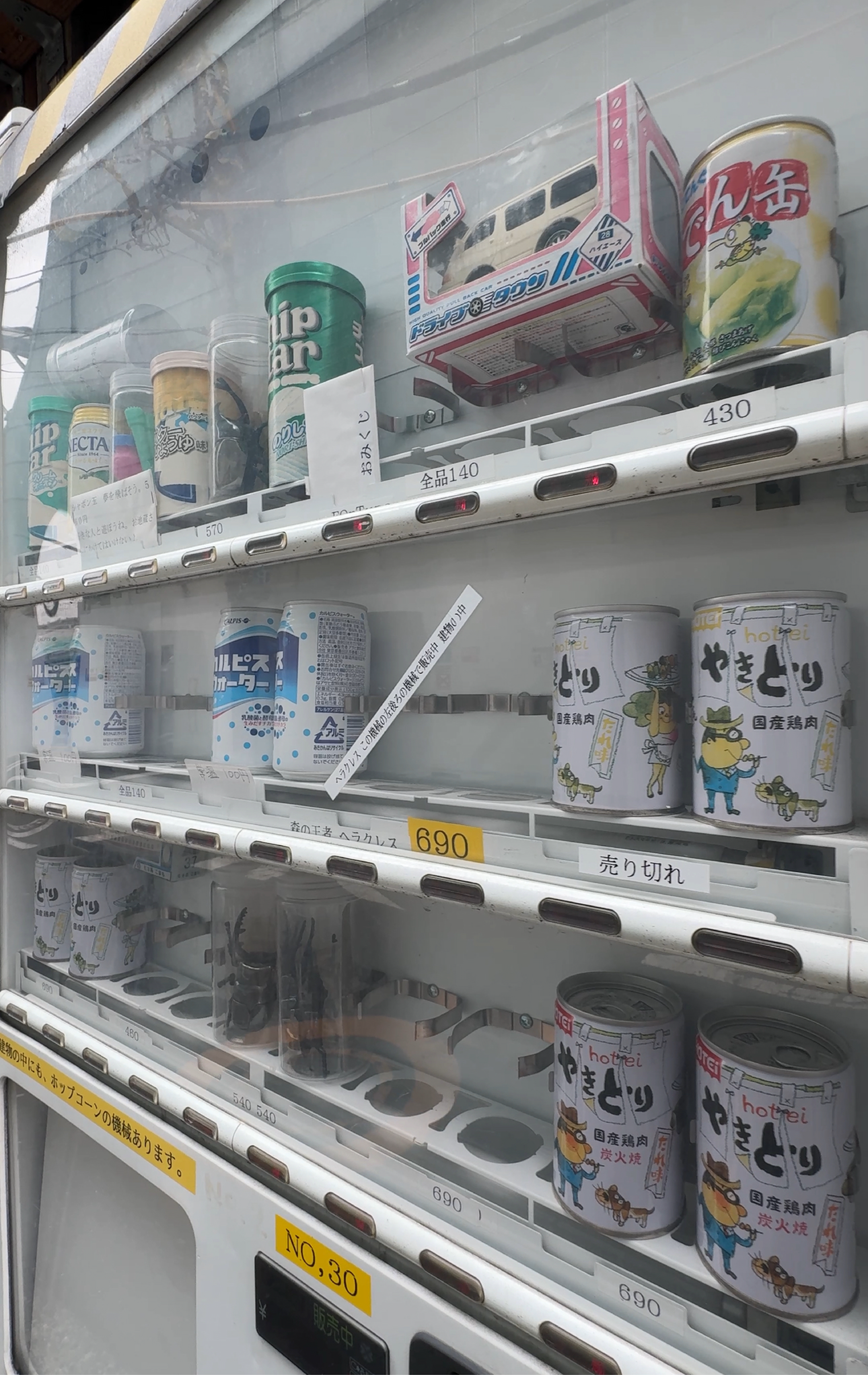Upon getting closer to the vending machines, you will find retro car toys and an insect replica (Hercules beetle) displayed next to familiar beverages and snacks. . . We couldn’t take our eyes off the strange assortment of items.