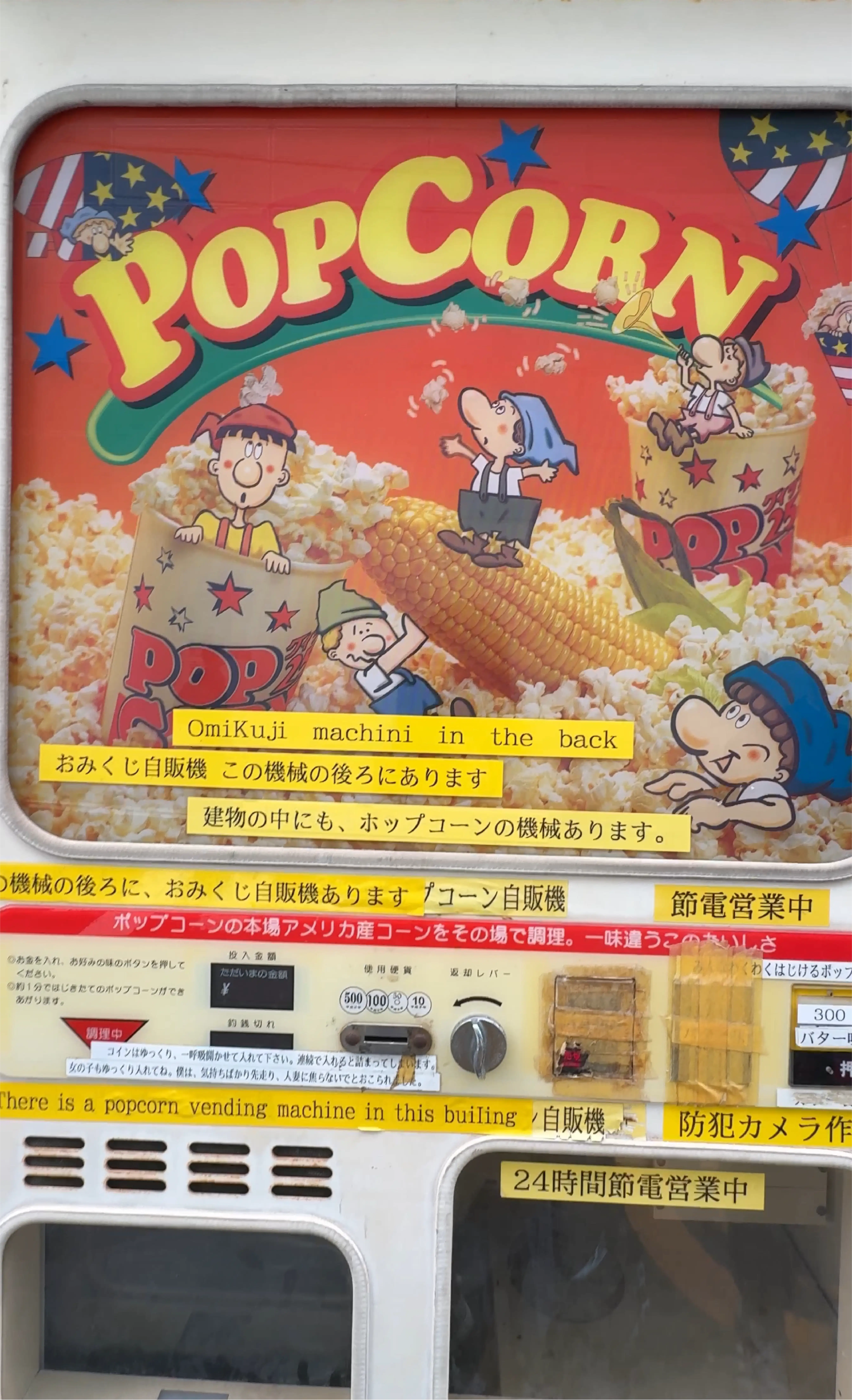 We even found a popcorn vending machine that we hardly ever see these days! We were a little hungry, so we decided to get one to see if it was really working.