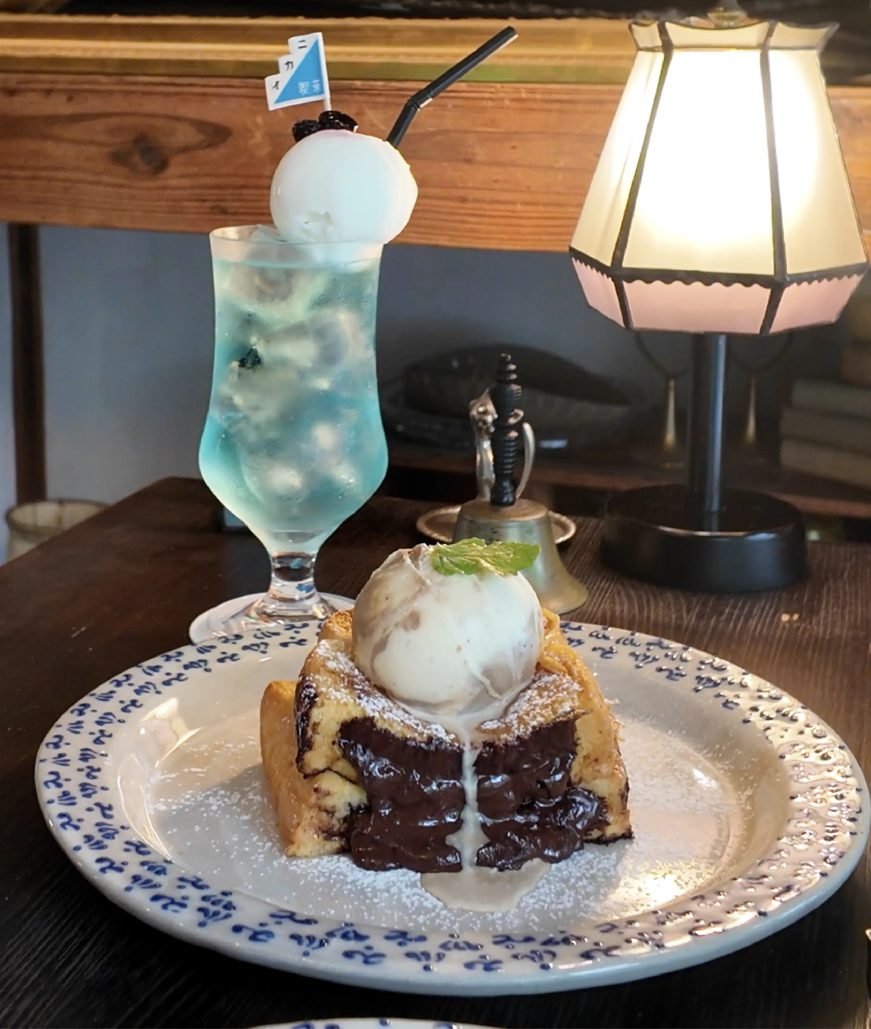 Kissa Nikai’s famous menu items are Nikai’s Cream Soda and Nikai’s French Toast. Nikai’s Cream Soda is a soda float featuring yogurt ice cream on ramune-flavored soda. For Nikai’s French Toast, you can choose from four different flavors: espresso vanilla, banana caramel nuts, strawberry chocolate, and matcha chocolate. These two items also go well together.